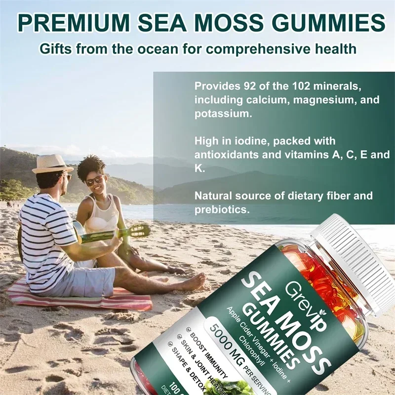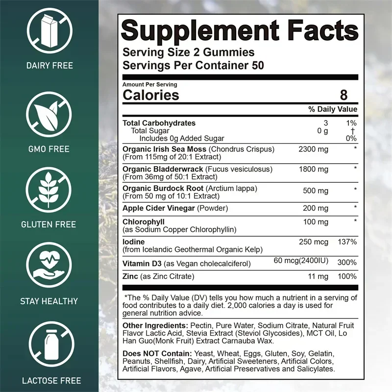 Sea Moss Gummies are carefully crafted with Irish sea moss from the coast of North America, iodine, burdock root, fucus vesiculosus, chlorophyll, vitamin D3, and unfiltered apple cider vinegar. They are naturally sweetened with no added sugar, making them a healthier alternative to traditional gummies.
